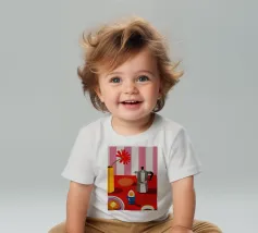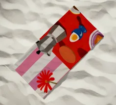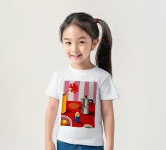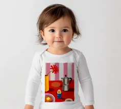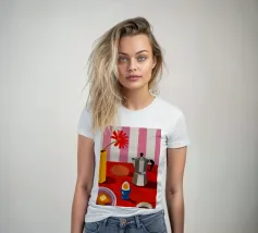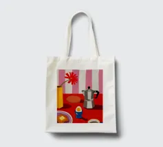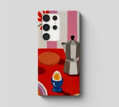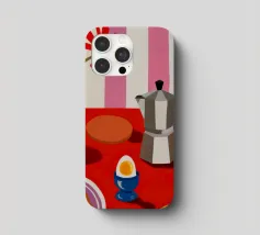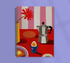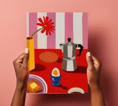Una scena di colazione colorata e grafica con una caffettiera, una tazza di caffè, un uovo sodo e un toast su uno sfondo a strisce rosse e rosa. Cattura l'energia e il rituale di una mattina moderna.