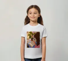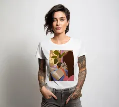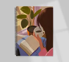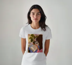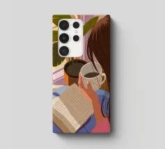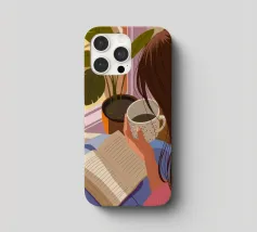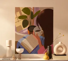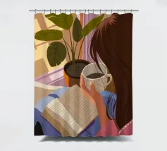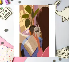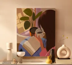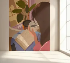 Questo dipinto raffigura una persona seduta accanto a una finestra, che sorseggia una bevanda calda leggendo un libro. La luce soffusa del mattino illumina la stanza, mettendo in risalto una pianta in vaso sul davanzale e creando un ambiente tranquillo.