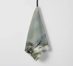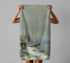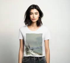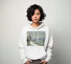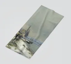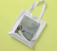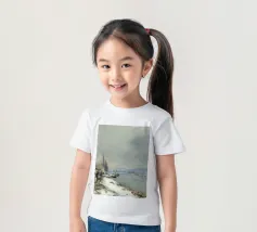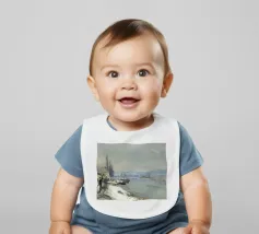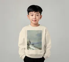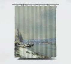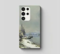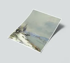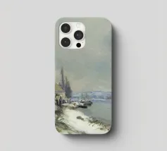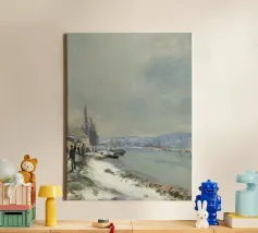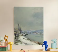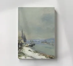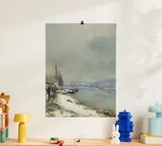 Questo tranquillo paesaggio invernale sulla riva del fiume mostra una passeggiata innevata con escursionisti, dolci colline e una distesa tranquilla sotto un luminoso cielo invernale. Le sottili sfumature di blu, grigio e bianco creano un'atmosfera invernale minimalista, piena di leggerezza e tranquillità. La scena combina un paesaggio fluviale in inverno, un'illustrazione naturalistica romantica, un'estetica invernale scandinava, un'arte paesaggistica senza tempo, una passeggiata in riva al mare sotto la neve e motivi naturalistici tranquilli. Ideale come murale invernale, arte da parete moderna, arredamento accogliente per la casa, decorazione naturale per il soggiorno, arte per gli amanti della natura.