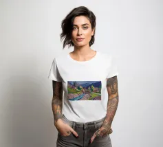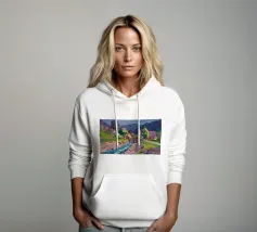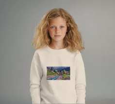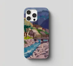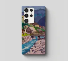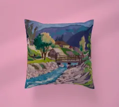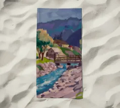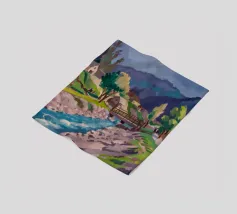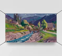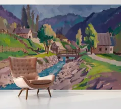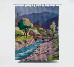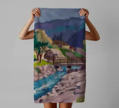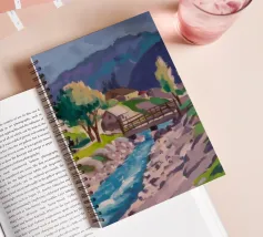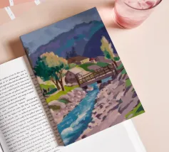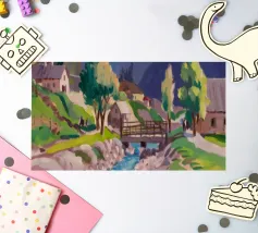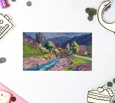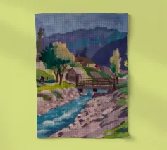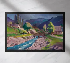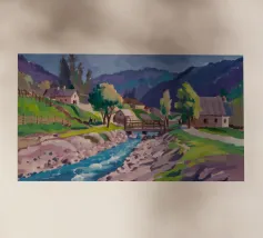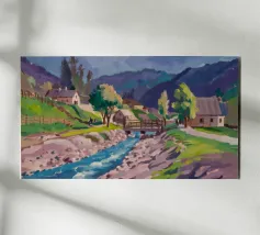 Un sereno dipinto di paesaggio raffigura un limpido ruscello che scorre in una valle, con un ponte di legno che lo attraversa e che conduce a case immerse tra alberi e dolci colline sotto un cielo morbido, trasmettendo un senso di pacifica bellezza naturale.