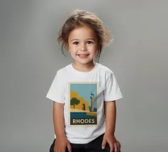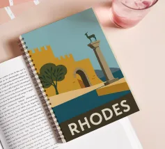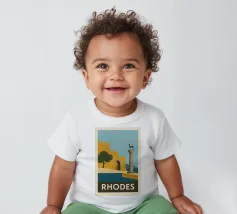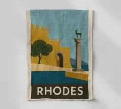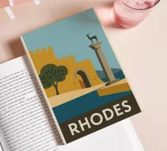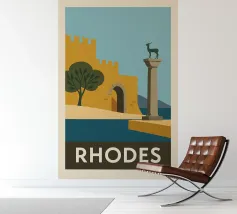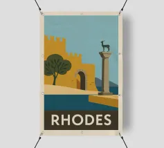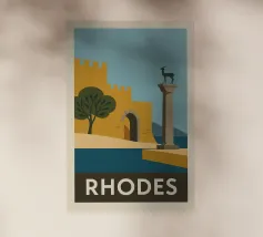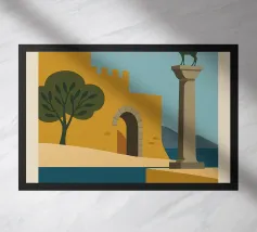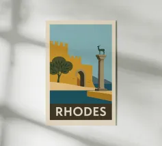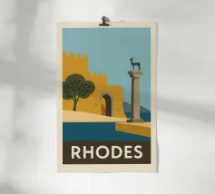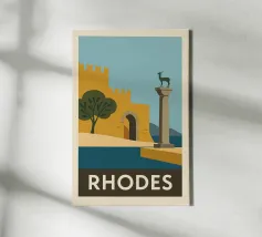 Con l'emblematica statua del cervo, le pareti ocra e il cielo blu brillante, questo poster cattura l'essenza di Rodi. Una città tra l'antichità e il Mediterraneo, presentata qui in uno stile solare e retrò. Un tocco di storia da appendere a casa vostra.