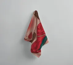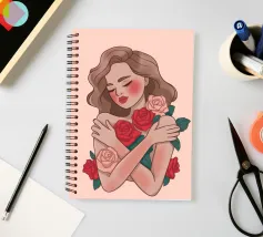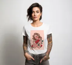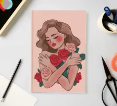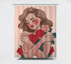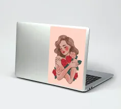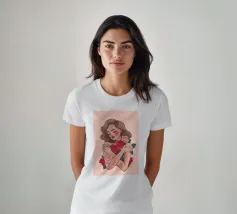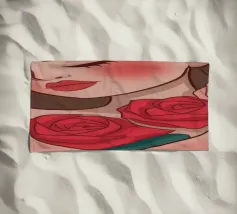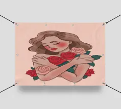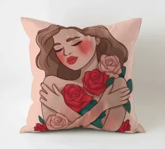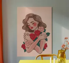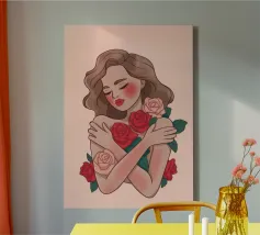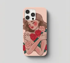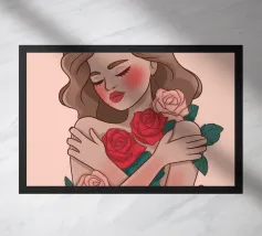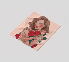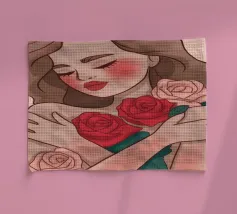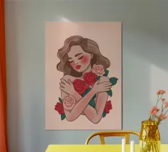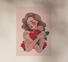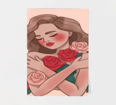 Un tenero ritratto di una persona che stringe al petto un bouquet di rose. La semplicità dello sfondo sottolinea l'intimità e le emozioni delicate del momento.