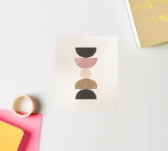 Aggiungete un tocco di fascino minimalista al vostro spazio con questa vibrante stampa d'arte astratta moderna di metà secolo, caratterizzata da un'ipnotica miscela di forme geometriche e fluide di acquerello su uno sfondo neutro morbido e cremoso. Con la sua calda atmosfera scandinavo-giapponese, non è solo arte: è un'atmosfera.