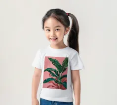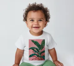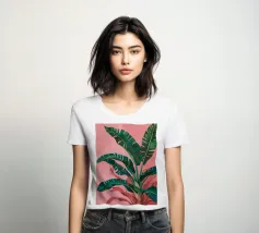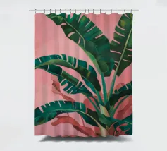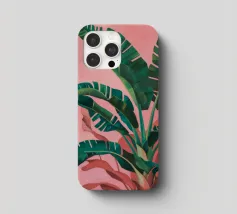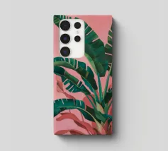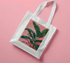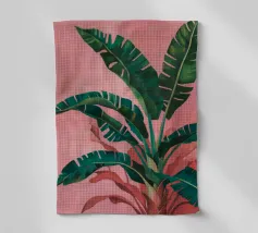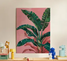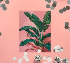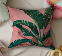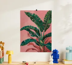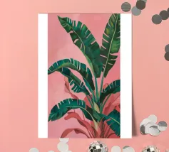 Un'illustrazione grafica e audace di grandi foglie di banano verdi su un vibrante sfondo rosa. La composizione è tropicale, moderna e ricca di stile energico e ad alto contrasto.