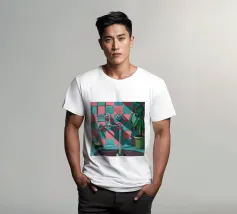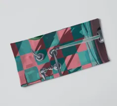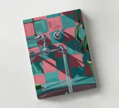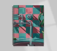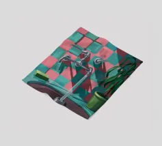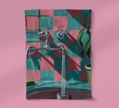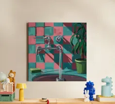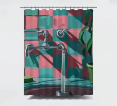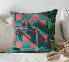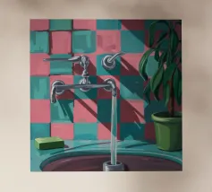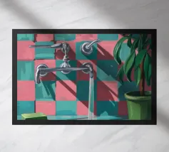 Una composizione moderna e grafica incentrata su un rubinetto cromato che proietta una forte ombra su una parete a scacchi rosa e verdi. Una pianta in vaso aggiunge un tocco di vita a questa scena di bagno elegante, astratta e pulita.