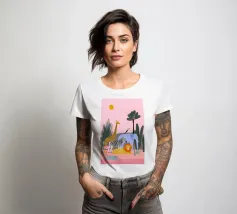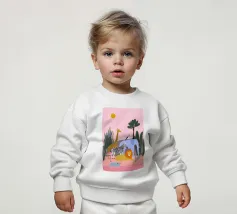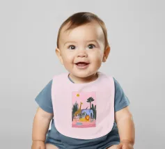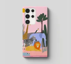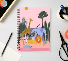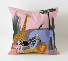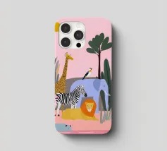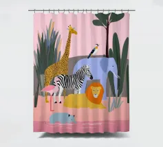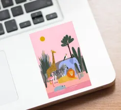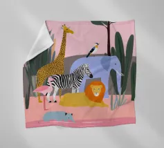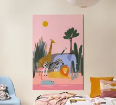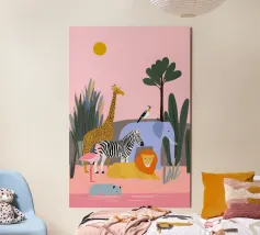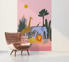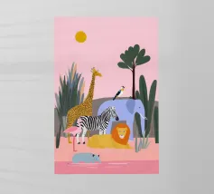 Un tranquillo safari con giraffa, zebra, leone, elefante, fenicottero e un piccolo vitello in riva al mare. Le forme pulite e i tenui colori pastello conferiscono un'atmosfera giocosa e moderna. Dolce per i bambini ed elegante per gli adulti.