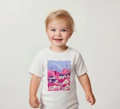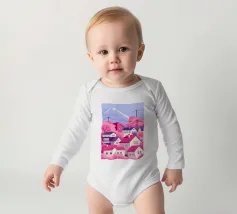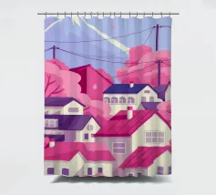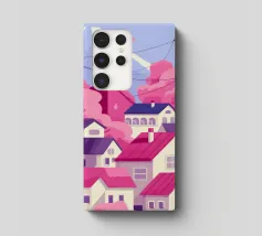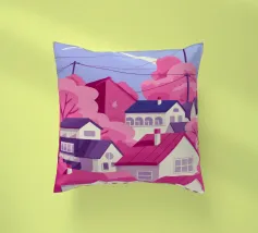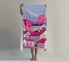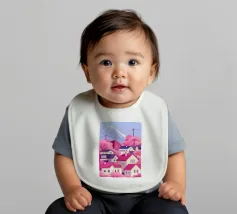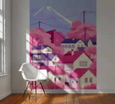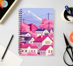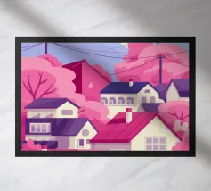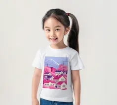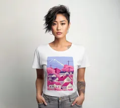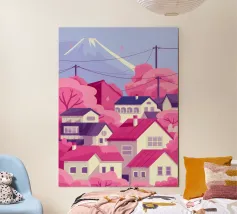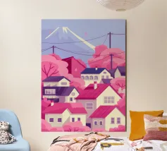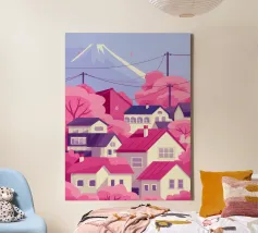 Una vibrante rappresentazione di un villaggio con le tradizionali case rosa, viola e bianche, annidato sotto una maestosa montagna innevata, probabilmente il Monte Fuji, con alberi di ciliegio in fiore in primo piano sotto un tenue cielo rosa.