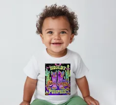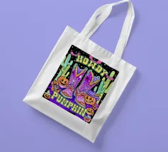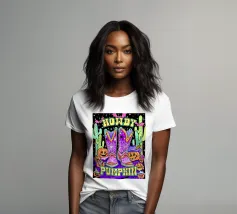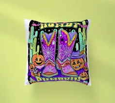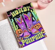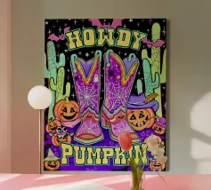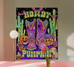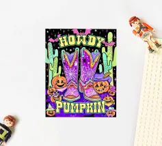 Un'immagine di Halloween con stivali da cowboy che dice "Howdy Pumpkin".