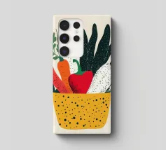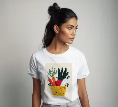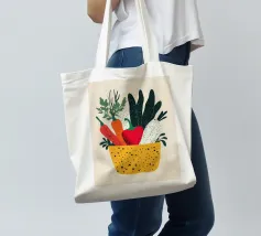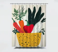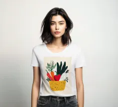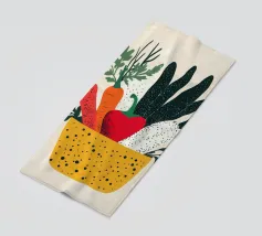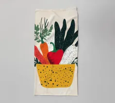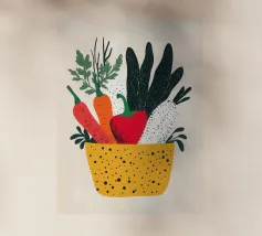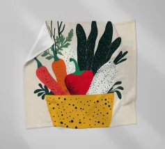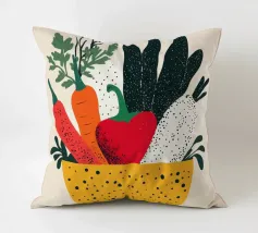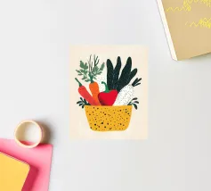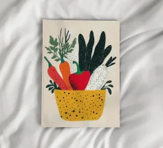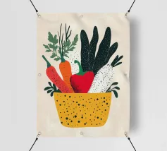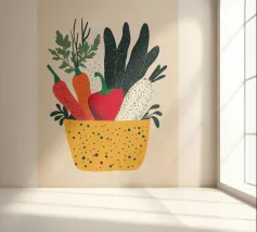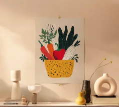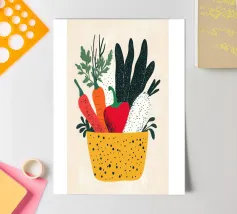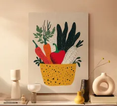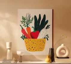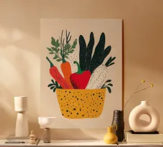 Un'esplosione di colori e texture per un'atmosfera calda e autentica. Questo cesto di verdure modernamente illustrato evoca la freschezza dei mercati e la bellezza dei prodotti crudi. Un must per un interno vivace.