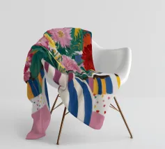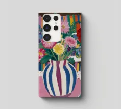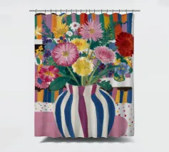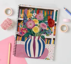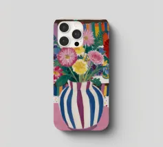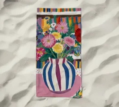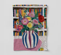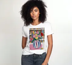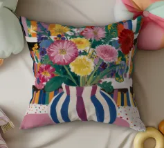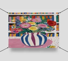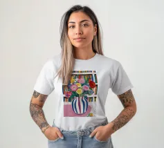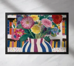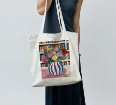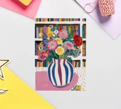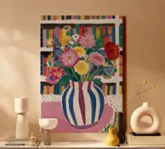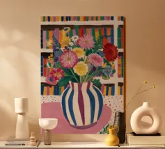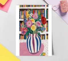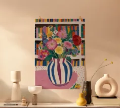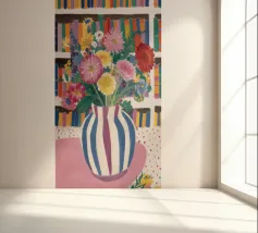 Un vivace bouquet di fiori in un vaso a righe, posto di fronte a una libreria colorata e affollata. La composizione è una miscela gioiosa e intellettuale di vita letteraria e bellezza naturale.
