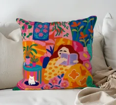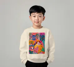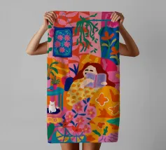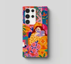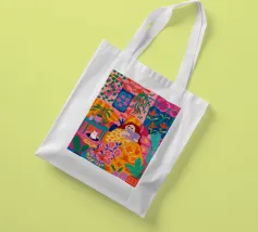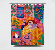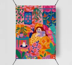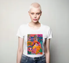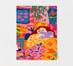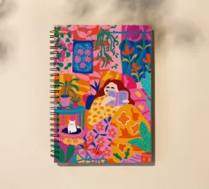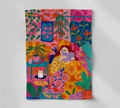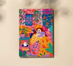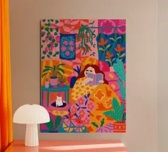 Un'illustrazione vibrante e massimalista di una persona circondata da una fitta collezione di piante d'appartamento colorate e da un arredamento eclettico. La scena è una gioiosa, caotica e bellissima celebrazione del paradiso personale di un amante delle piante.