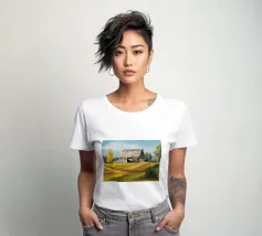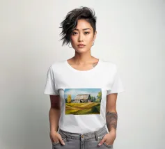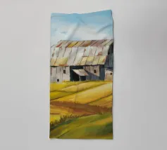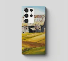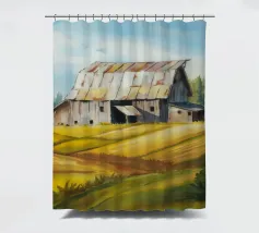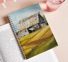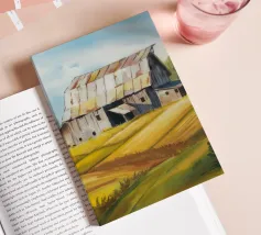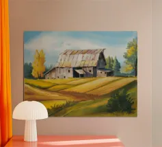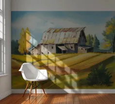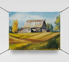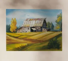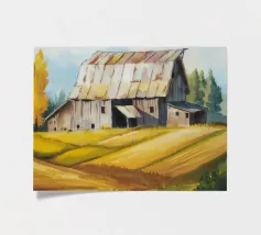 Un vecchio fienile rustico con tetto in metallo è circondato da alberi dai colori autunnali, che catturano la sensazione calda e nostalgica di una giornata autunnale di campagna.