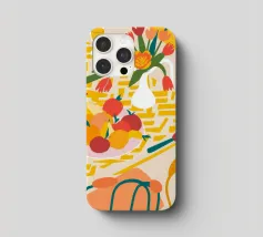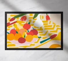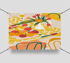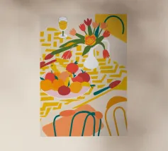 Un'allegra tavola imbandita con frutta fresca, pane e bevande, immersa nella luce dorata del sole.