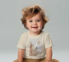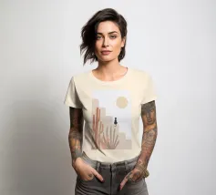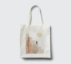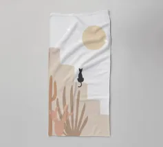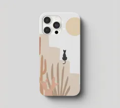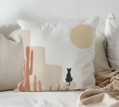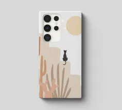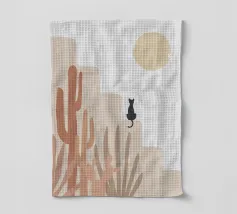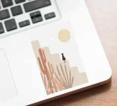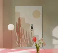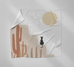 Illustrazione minimalista di un sereno paesaggio desertico con formazioni rocciose beige, cactus e piante del deserto in primo piano. Un gatto nero siede su una roccia sotto un grande sole o una luna giallo pallido, con stelle che punteggiano il cielo. Ideale per decorazioni a tema naturalistico e per gli amanti dell'arte stravagante.