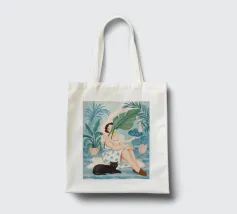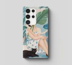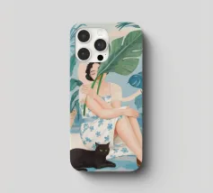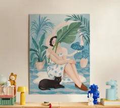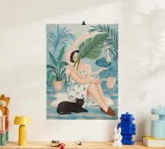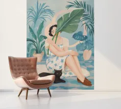 Il dipinto raffigura una persona seduta su una sedia, circondata da piante tropicali e da un gatto nero che giace nelle vicinanze. Lo sfondo è pieno di fogliame verde e di una parete azzurra.