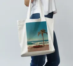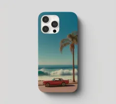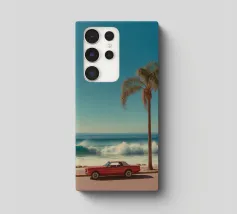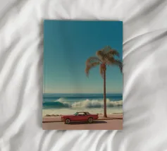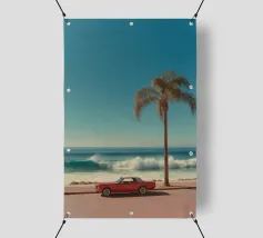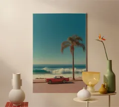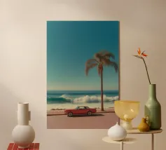 Catturate l'essenza di un'estate retrò con questa opera d'arte che raffigura una classica auto rossa parcheggiata in riva all'oceano, sotto un cielo azzurro e una palma solitaria. Perfetto per un'estetica vintage.