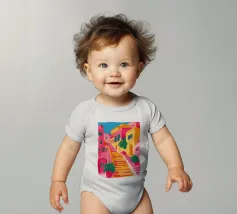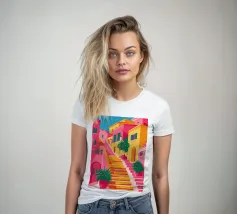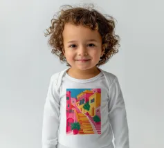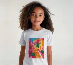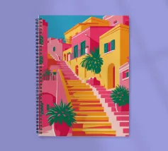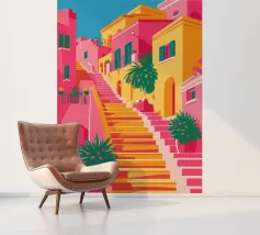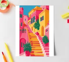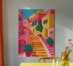 Una vivace illustrazione di una colorata scena di strada con una ripida scalinata, edifici dai colori vivaci e piante rigogliose, che evoca una città mediterranea o sudamericana.