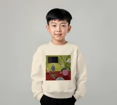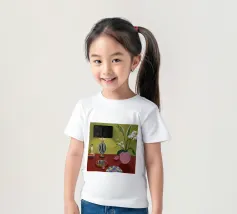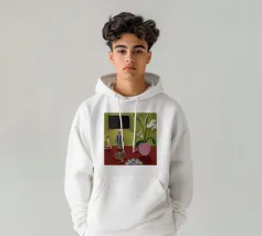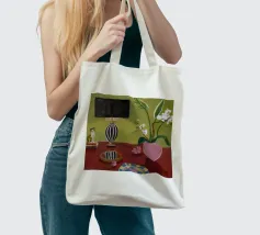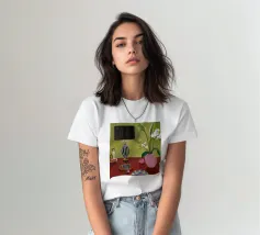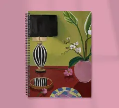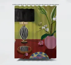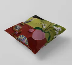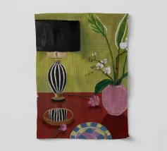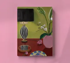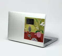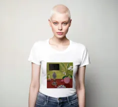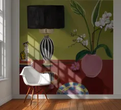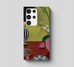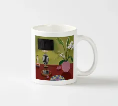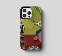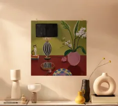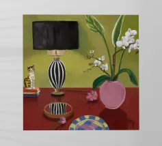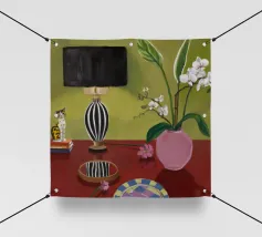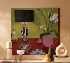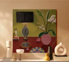 Una natura morta contemporanea mostra un vaso a righe con orchidee bianche posto su un tavolo rosso davanti a un televisore o a un monitor a schermo piatto nero, con altri oggetti vicini, su una parete verde.