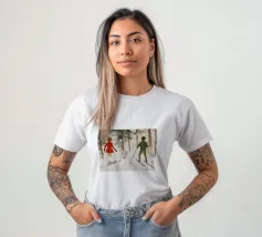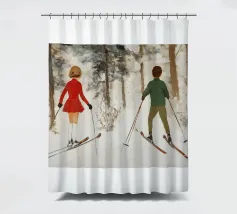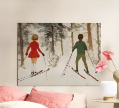 In questa affascinante scena invernale, due figure - una ragazza con un cappotto rosso e un ragazzo con una giacca verde - scivolano fianco a fianco sugli sci attraverso una foresta innevata. La pennellata è morbida e strutturata, creando l'atmosfera di un classico dipinto a olio. Il caldo gioco di toni rossi e verdi risalta meravigliosamente sulla neve chiara e sui colori tenui degli alberi. L'immagine trasmette una sensazione di amicizia, spensieratezza e gioia invernale - un ricordo nostalgico delle avventure infantili sulla neve.