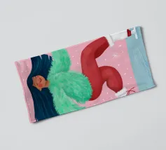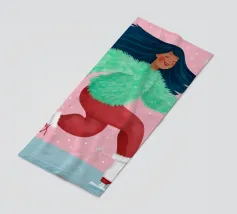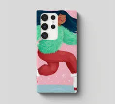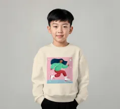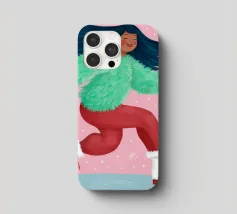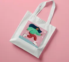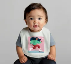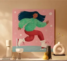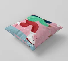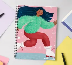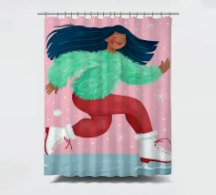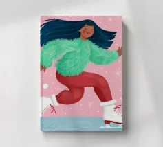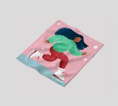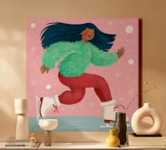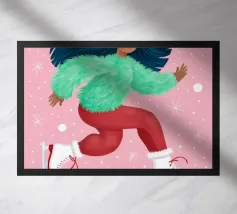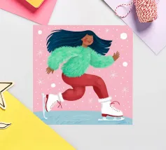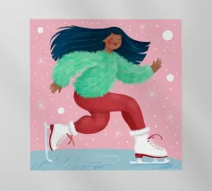 Una figura vestita con un maglione verde e pantaloni rossi pattina sul ghiaccio su uno sfondo rosa con fiocchi di neve. La figura sembra godersi la stagione invernale.