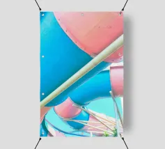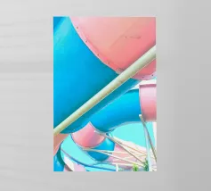 L'energia giocosa del divertimento estivo. Curve audaci in rossi, blu e gialli vivaci si contorcono e girano sotto il sole, invitando alla gioia, al movimento e alle risate spensierate. La scena evoca eccitazione, nostalgia e lo spirito luminoso delle giornate calde e degli spruzzi freschi.