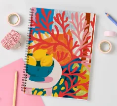 Una vivace natura morta con una ciotola blu di limoni su uno sfondo energico di fogliame rosso, simile al corallo, e rami bianchi, che crea una combinazione unica e surreale di mare e terra.