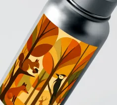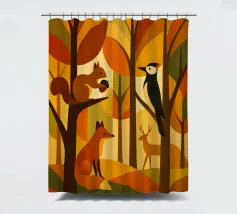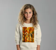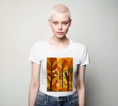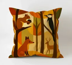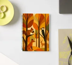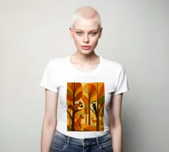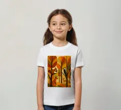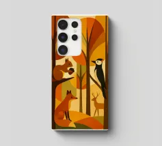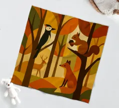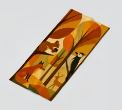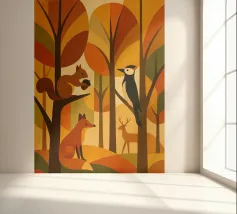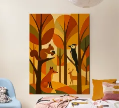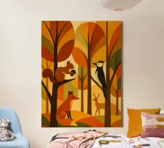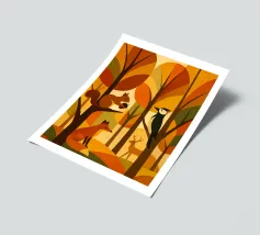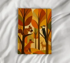 Una scena di foresta stilizzata, resa in calde tonalità autunnali: arance ricche, marroni profondi, gialli dorati e verdi tenui. La tavolozza dei colori cattura l'essenza dell'autunno, evocando un senso di calore e di calma. L'opera presenta diversi animali della foresta: uno scoiattolo appollaiato su un ramo con una ghianda, una volpe seduta, un picchio aggrappato a un tronco d'albero e un cervo in piedi sullo sfondo. Ogni animale è disegnato in uno stile semplice, geometrico e astratto, che si armonizza perfettamente con le forme angolari degli alberi e delle foglie.
