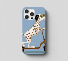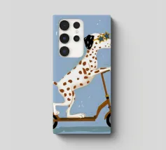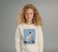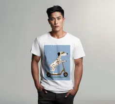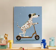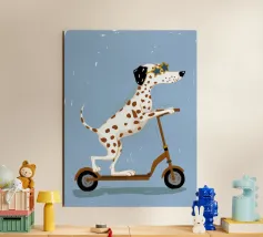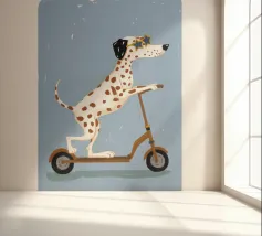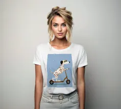 Un'illustrazione stravagante di un cane dalmata felice con un collare rosso, che cavalca con sicurezza un monopattino su uno sfondo blu chiaro, trasmettendo gioia pura ed energia giocosa.