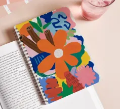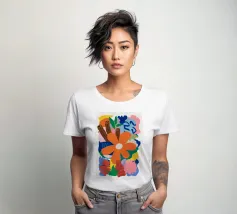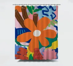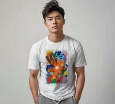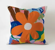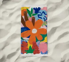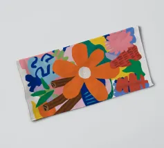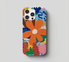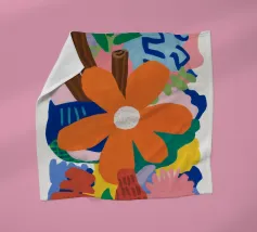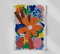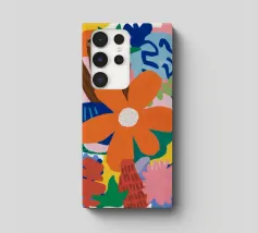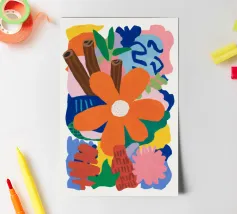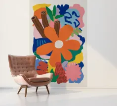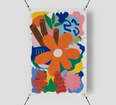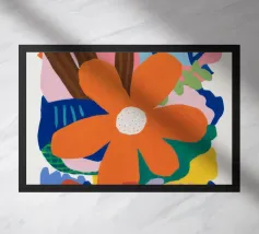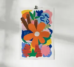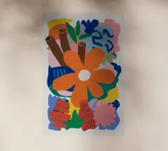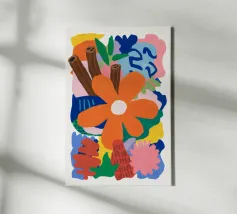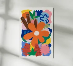 Una forma centrale arancione simile a un fiore esplode in mezzo a un turbinio di forme astratte ed elementi botanici. La composizione è dinamica ed espressiva, con steli blu, accenti rossi e uno sfondo beige strutturato, che cattura un momento di energia creativa.