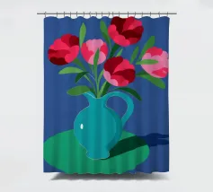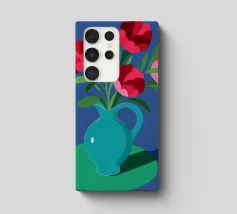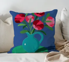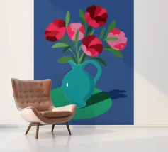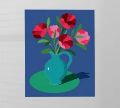 Una suggestiva natura morta con un bouquet di fiori rosa e rossi in una bella brocca blu turchese. La composizione semplice su uno sfondo blu scuro fa risaltare i colori vivaci dei fiori.