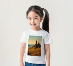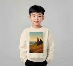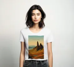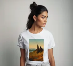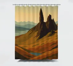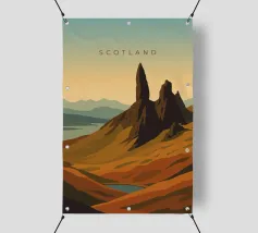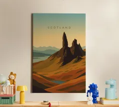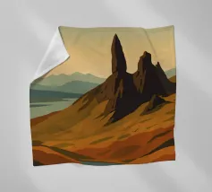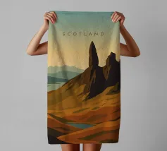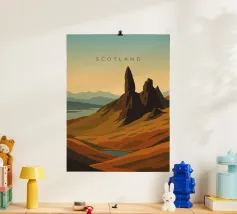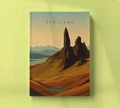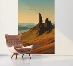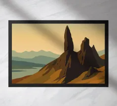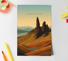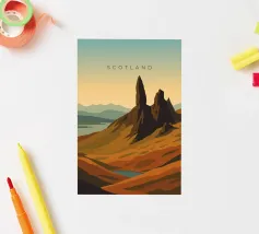 Disegno di viaggio minimalista della Scozia con il famoso monte Old Man of Storr sulla penisola dell'Isola di Skye, in Scozia. Questo motivo tipico del paesaggio scozzese è perfetto per tutti i viaggiatori che amano il paesaggio aspro delle regioni montuose della Scozia.