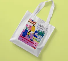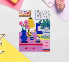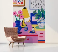 Una scrivania eccentrica con lampada rosa, fiori in vaso, matrioska e tè conferisce una personalità giocosa.