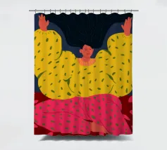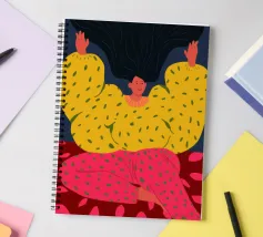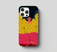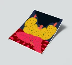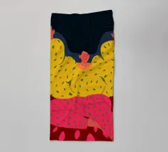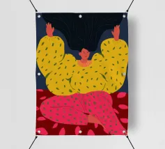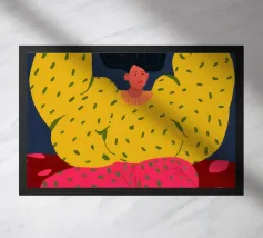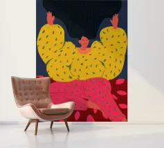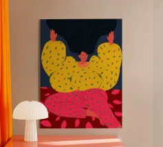 Illustrazione di una donna con top giallo a pois e pantaloni rosa, sdraiata sul pavimento. La sua posa rilassata e soddisfatta crea una scena di comodo, elegante e tranquillo svago.