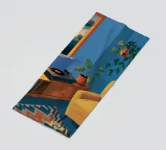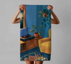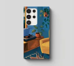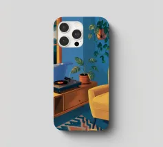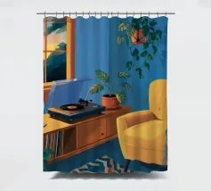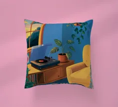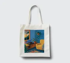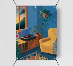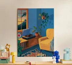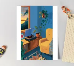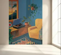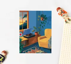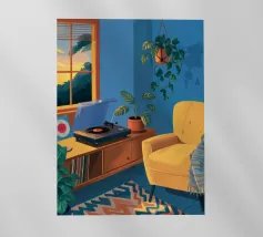 Un angolo accogliente di una stanza al tramonto, con una poltrona gialla, un giradischi su un tavolino e una pianta in vaso. La vista attraverso la finestra mostra un cielo crepuscolare, creando un'atmosfera fresca, rilassata e musicale.