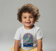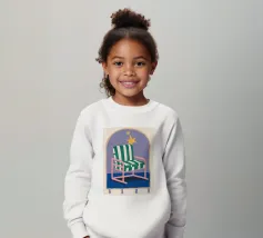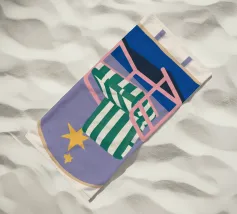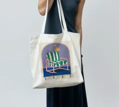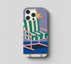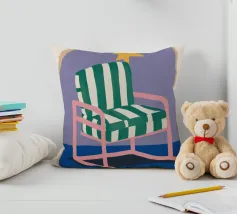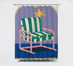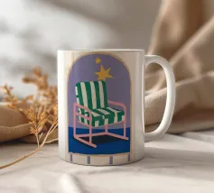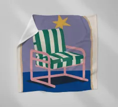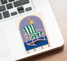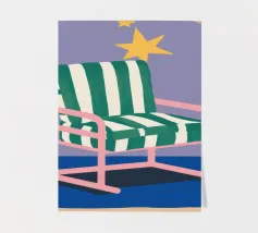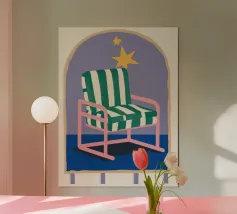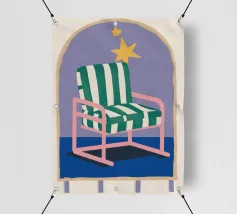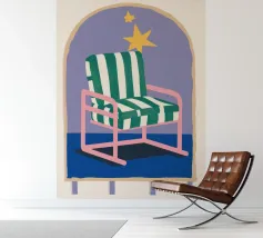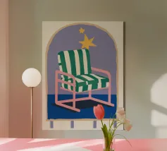 Un'illustrazione stravagante di una poltrona a righe bianche e verdi posta sotto un arco stellato. L'immagine è semplice ma magica e suggerisce un luogo speciale per sognare e osservare le stelle.