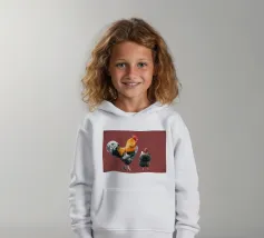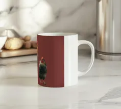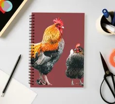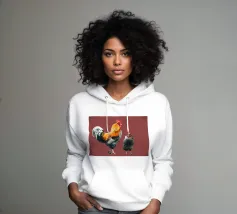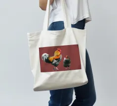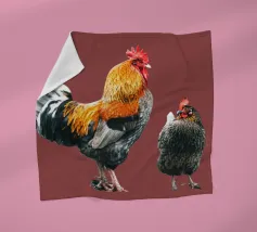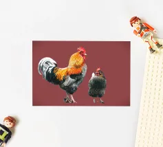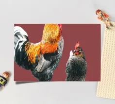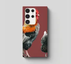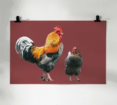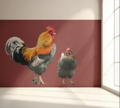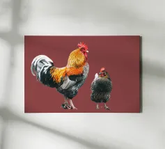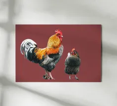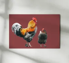 La coppia di galli in piedi l'uno accanto all'altro sembra così vicina e calorosa. Il gallo con le sue piume colorate, la cresta rosso vivo, il portamento fiero e gli occhi luminosi mostra forza e maestosità. Accanto a lui c'è una piccola gallina con le sue piume dorate, gli occhi gentili, la postura aggraziata e delicata. I due stanno l'uno accanto all'altra come una coppia armoniosa - uno forte, l'altro gentile - evocando l'immagine di attaccamento, protezione e forte affetto nella vita naturale.
