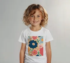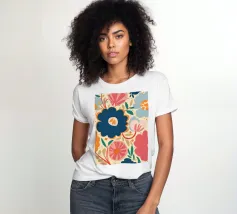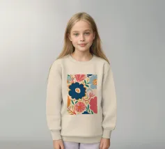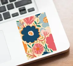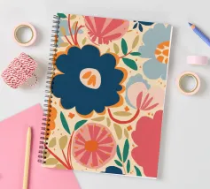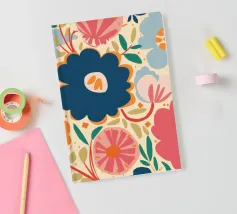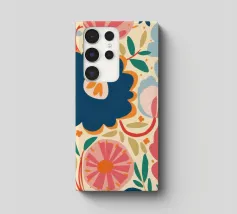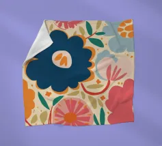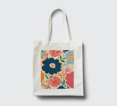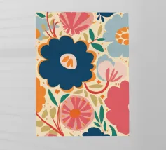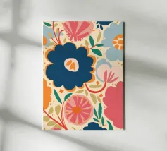 Un grande fiore blu stilizzato si staglia su uno sfondo caldo e neutro, creando un'opera d'arte botanica semplice, elegante e moderna.