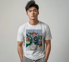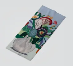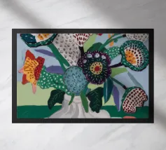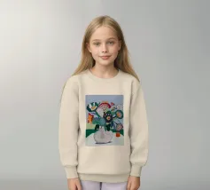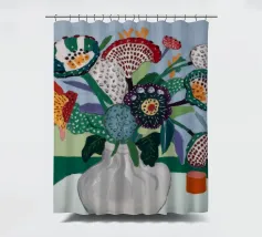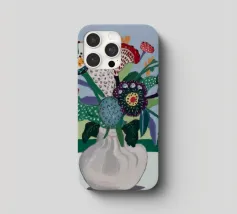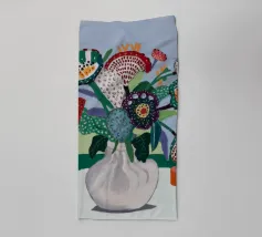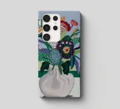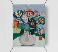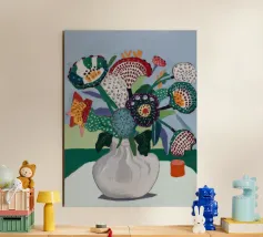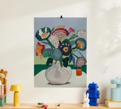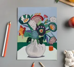 Una natura morta stilizzata di fiori colorati con motivi unici e centri neri in un semplice vaso bianco, su uno sfondo blu chiaro che evoca un'atmosfera grafica e retrò.