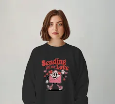 Un allegro personaggio di una busta cammina con entusiasmo, circondato da cuori, trasmettendo un messaggio d'affetto. Il testo in alto recita "Sending all my Love".