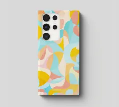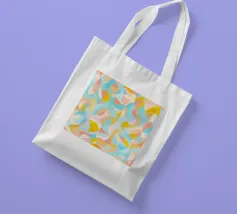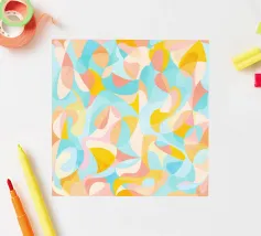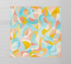 Un motivo astratto moderno e giocoso, caratterizzato da morbide curve geometriche e forme fluide in una tavolozza di colori pastello blu, arancione e giallo. Il disegno è allegro, carino e femminile, con una sensazione di leggerezza e ariosità. Le forme si intrecciano in modo fluido, creando un senso di movimento pur mantenendo la semplicità.