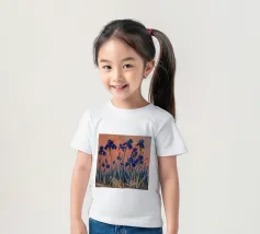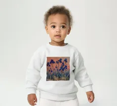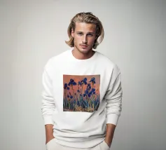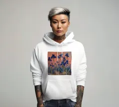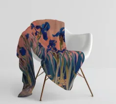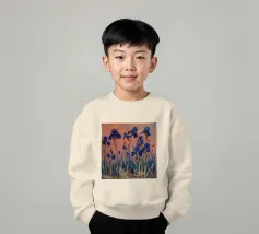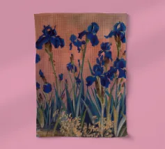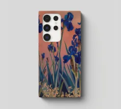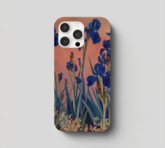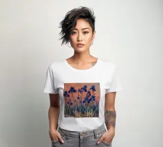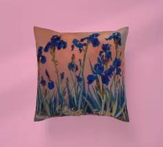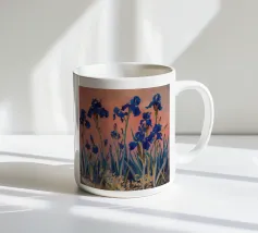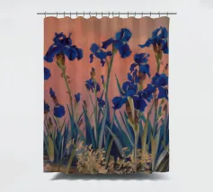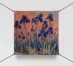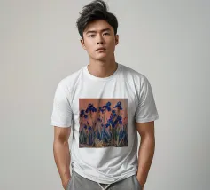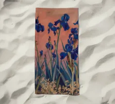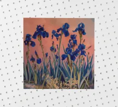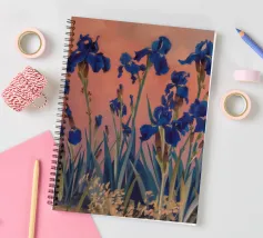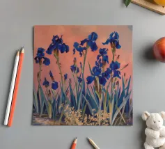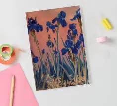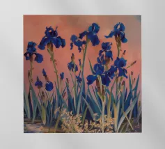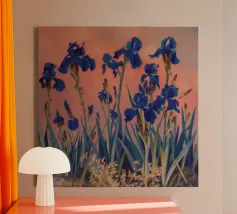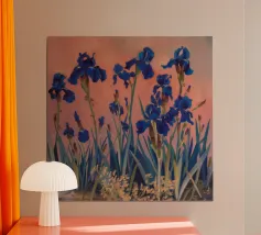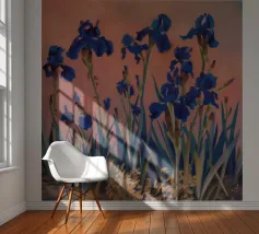 Delicati iris viola ondeggiano su un cielo color pesca. Una delicata celebrazione del crepuscolo e dell'eleganza.