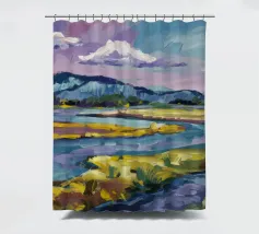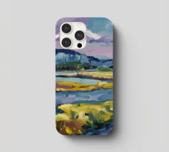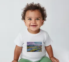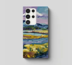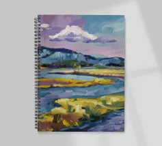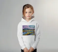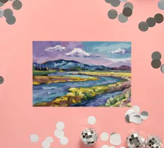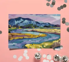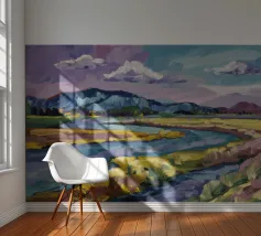 Un paesaggio sereno con un fiume serpeggiante che scorre tra campi aperti e che conduce verso lontane e maestose montagne innevate, il tutto sotto un bellissimo cielo ornato da soffici nuvole rosa.