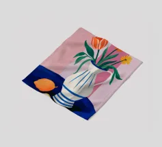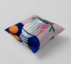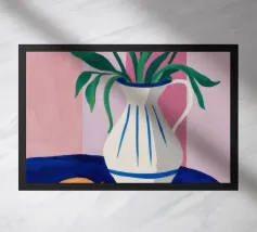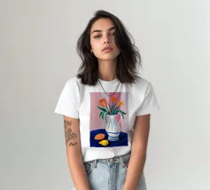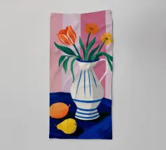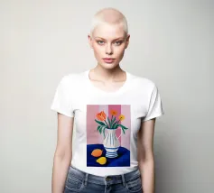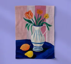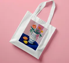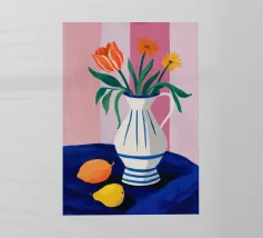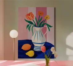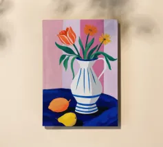 Un'affascinante natura morta mette in mostra tulipani arancioni in un vaso a righe bianche e blu, con limoni sparsi su una superficie rosa, creando una scena allegra e ben composta.