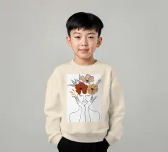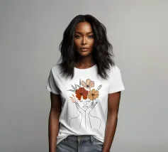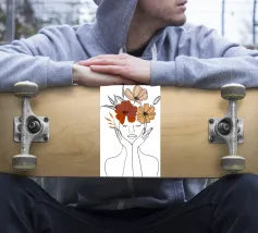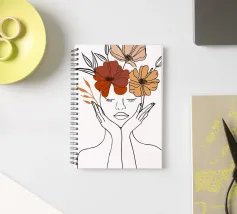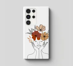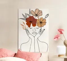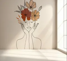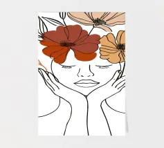 Un disegno al tratto raffigura un volto sereno con gli occhi chiusi, incorniciato da mani e ornato da grandi fiori in fiore. La tavolozza dei colori è caratterizzata da toni caldi di ruggine, arancio e beige, che aggiungono un effetto naturale e rilassante.