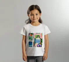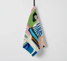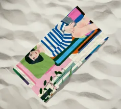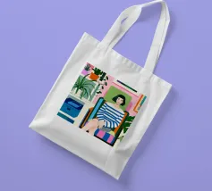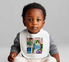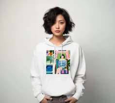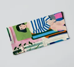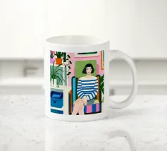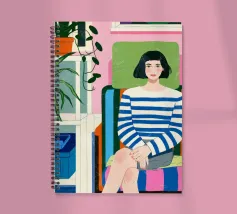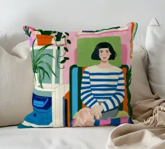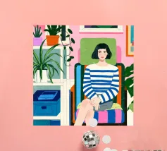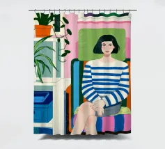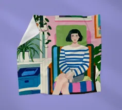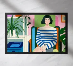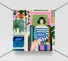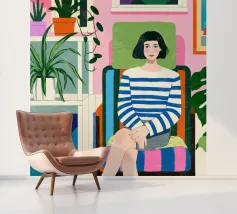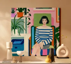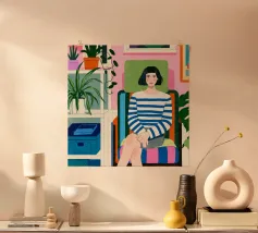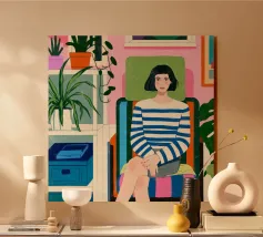 Questa opera d'arte raffigura una persona seduta in una stanza colorata che indossa abiti a righe. Lo sfondo comprende varie piante e mobili, creando un ambiente accogliente e sereno.