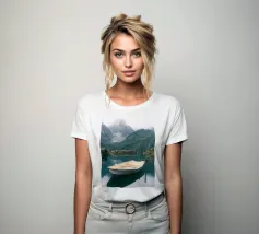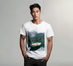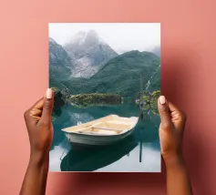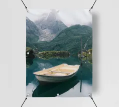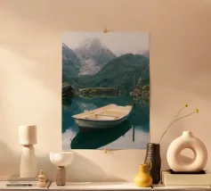 Una barca solitaria riposa pacificamente su un lago di montagna cristallino, circondato da cime imponenti e avvolte dalla nebbia e da una vegetazione lussureggiante. L'acqua a specchio riflette la bellezza senza tempo del paesaggio, creando una scena che sembra non essere stata intaccata dal tempo. Perfetto per portare calma e ispirazione in qualsiasi ambiente.