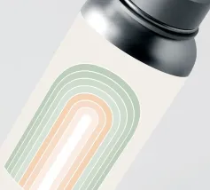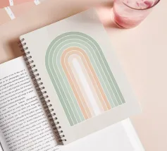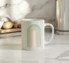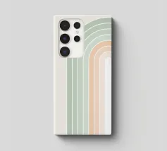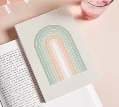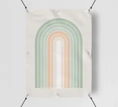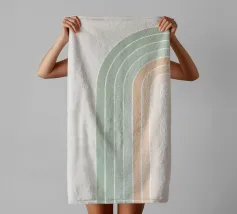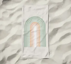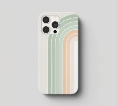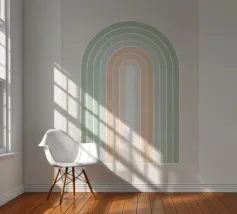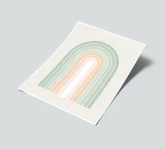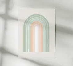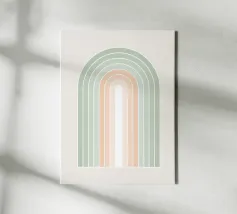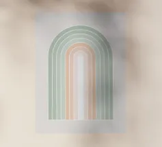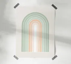 Una serena illustrazione grafica astratta dell'arcobaleno con linee e forme geometriche bianche in tonalità verde salvia e morbide sfumature di pesca su uno sfondo beige. Questo disegno minimale evoca l'inizio della primavera, la calma e l'ottimismo, perfetto per aggiungere un fascino di ispirazione rétro al vostro spazio. Ideale per ravvivare una stanza tranquilla, dona armonia ad opere d'arte da parete, cuscini e accessori, offrendo un'estetica pacifica per una vita moderna.