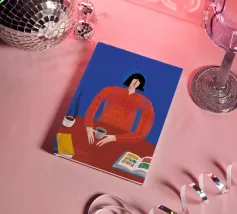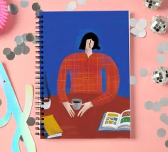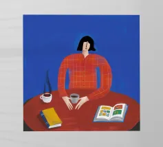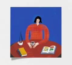 Illustrazione di una donna con capelli rossi e occhiali seduta a un tavolo con un libro aperto, un altro libro e una tazza. La camicia arancione a scacchi e lo sfondo blu creano una scena colorata e accogliente di lettura o studio.
