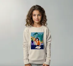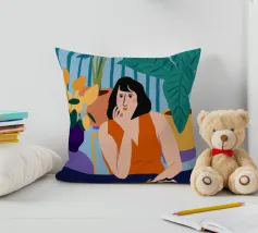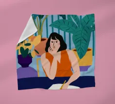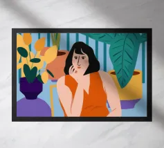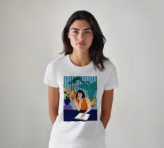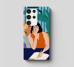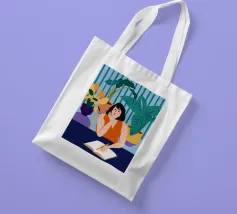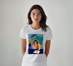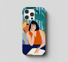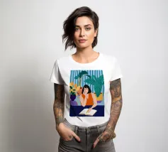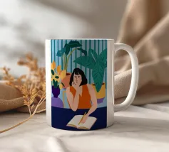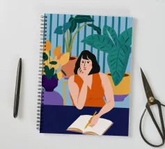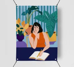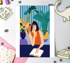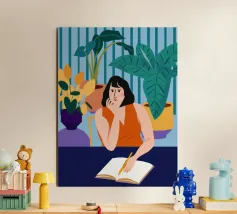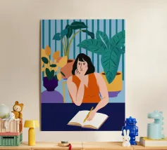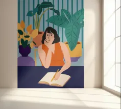 Un'illustrazione di una donna che legge intensamente un libro alla sua scrivania, circondata da piante d'appartamento e illuminata da una lampada, che trasmette un senso di tranquilla concentrazione.