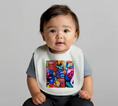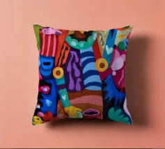 Una parata di creature fantastiche dai tratti esagerati sfila su uno sfondo di giocosi motivi astratti.